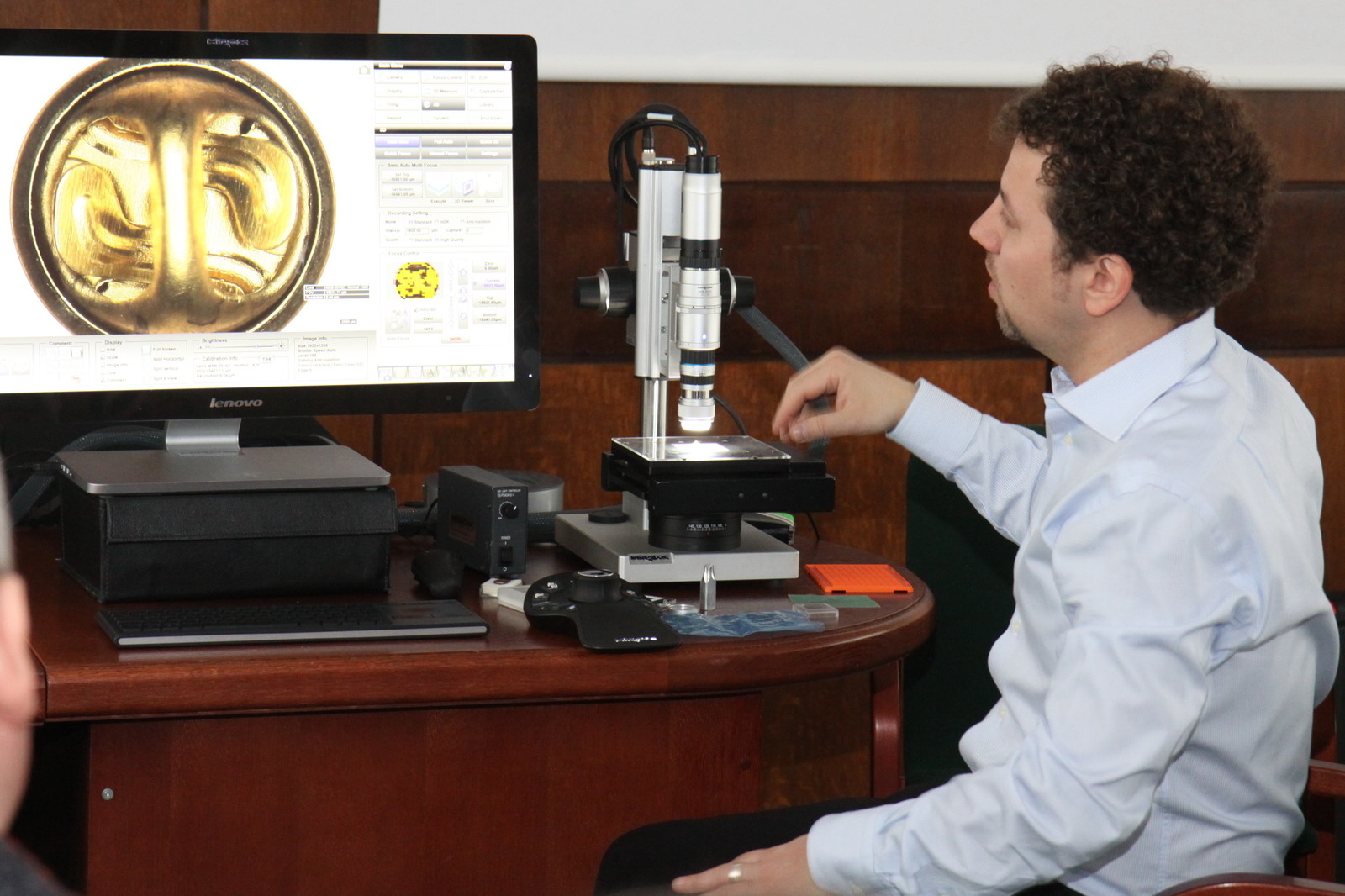 Spotkanie otworzył dr hab. inż. Jerzy Potencki, prof. PRz z Katedry Systemów Elektronicznych i Telekomunikacyjnych, zachęcając zebranych do wysłuchania i zapoznania się z możliwościami wielofunkcyjnego i najnowocześniejszego mikroskopu RH- 2000 3D Hirox. Prezentację poprowadzili Katarzyna Piekarska i Emilien Leonhardt z Hirox. Przybliżyli historię firmy oraz przedstawili zalety urządzenia: inspekcję na żywo zapisu filmów, tworzenie obrazu panoramicznego, kontrolę jakości, badanie powierzchni, dużą rozdzielczość. Mikroskop dokonuje m.in. pomiarów 2 i 3D oraz profilowania 3D, pomiaru powierzchni i objętości, łączenia obrazów 3D.