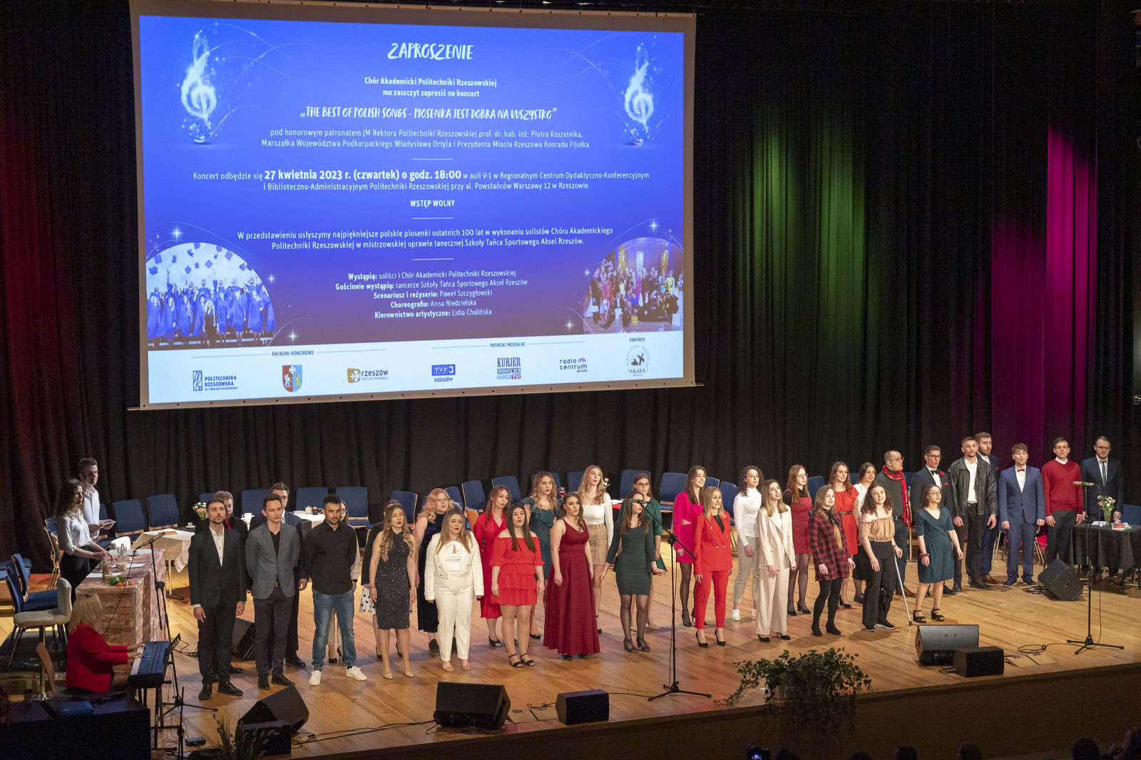 Koncert „The Best of polish songs-Piosenka jest dobra na wszystko” Chóru Akademickiego Politechniki Rzeszowskiej odbył się pod honorowym patronatem rektora prof. dr. hab. inż. Piotra Koszelnika, marszałka województwa podkarpackiego Władysława Ortyla oraz prezydenta miasta Rzeszowa Konrada Fijołka. Wydarzenie otworzył prorektor ds. studenckich Politechniki Rzeszowskiej prof. dr hab. Grzegorz Ostasz.